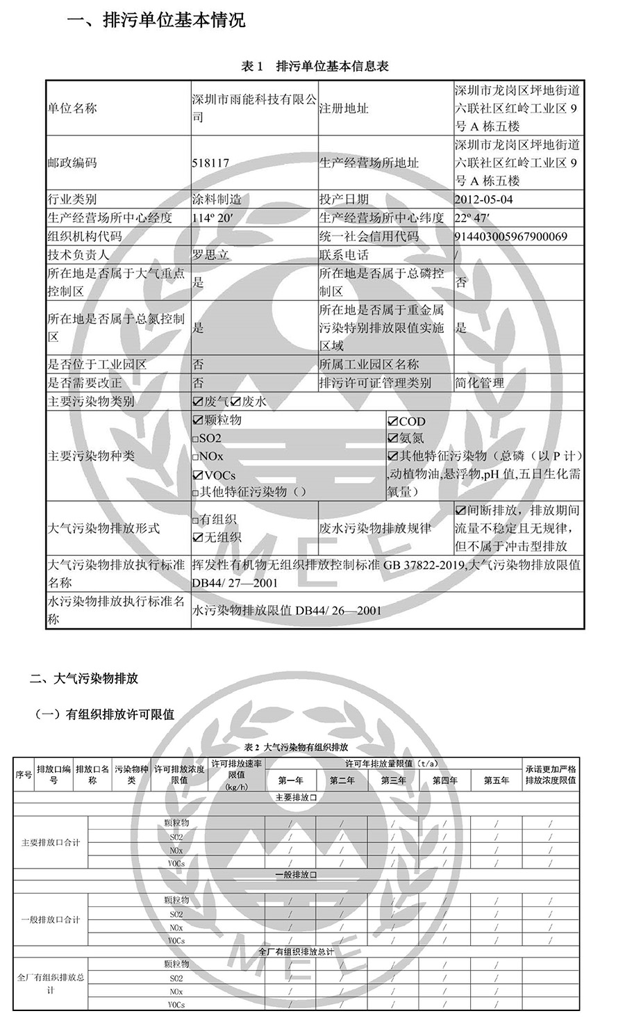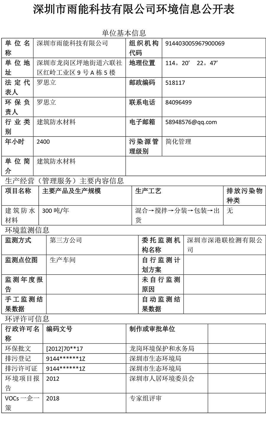 深圳市雨能科技有限公司环境信息公开表